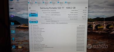100% stato salute disco Vendo per inutilizzo SSD esterno portatile Samsung T7 da 1TB in colorazione Indigo Blue. Il dispositivo è estremamente compatto (grande quanto una carta di credito) e incredibilmente veloce, ideale per backup, editing video 4K o per espandere la memoria di PC, Mac, smartphone e console (PS5/Xbox). Caratteristiche principali: Capacità: 1TB. Velocità: Fino a 1.050 MB/s in lettura e 1.000 MB/s in scrittura (USB 3.2 Gen 2). Condizioni: Perfette, pari al nuovo. Incluso nella confezione: Scatola originale, cavo USB Type-C to C e cavo USB Type-C to A. Sicurezza: Supporta la protezione con password ed è resistente alle cadute fino a 2 metri.