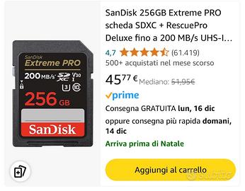 SanDisk 256GB Extreme PRO scheda SDXC + RescuePro Deluxe fino a 200 MB/s UHS-I Class 10 U3 V30 Confezione aperta ma scheda sd nuova mai utilizzata