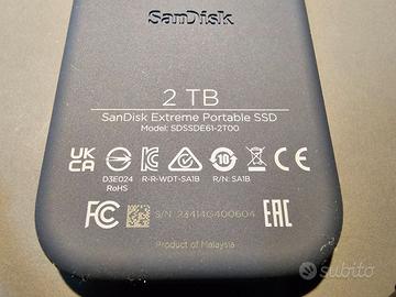 Vendo per inutilizzo SSD esterno SanDisk Extreme Portable SSD da 2 Terabyte (modello SDSSDE61-2T00). L'unità è nuova e mai utilizzata (zero ore di attività). Non possiedo la confezione originale, ma il disco è intonso: all'interno sono ancora presenti i software SanDisk precaricati di fabbrica e non è mai stato scritto alcun dato. Specifiche principali: Capacità: 2TB. Velocità: Modello V2 fino a 1050 MB/s (NVMe). Protezione: Certificazione IP65 (acqua/polvere) e guscio gommato resistente agli urti. Accessori: Completo di cavetto USB-C originale e adattatore USB-A originale. Modalità di vendita: Prezzo: € 215. Scambio a mano a Brescia e provincia. Spedizione disponibile tramite TuttoSubito (gestione sicura con pagamento protetto e corriere tracciato). Massima serietà. Il prodotto è originale e perfetto, come visibile in foto.