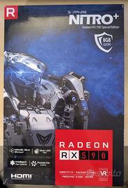 Sapphire RX 590 Nitro+ Special Edition da 8GB, in condizioni estetiche quasi perfette come da foto. Utilizzata sempre in un case con filtri antipolvere, quindi ben mantenuta nel tempo; mai overclockata. Scheda ferma da circa due anni; Pulita e testata senza problemi con FurMark, 3DMark, OCCT e Unigine. Disponibili anche screenshot in-game (Doom Eternal) a conferma del corretto funzionamento. Scatola originale inclusa. Caratteristiche principali: GPU AMD Polaris 30 8GB di memoria GDDR5 Frequenza boost fino a circa 1560 MHz (factory overclock) Dual BIOS selezionabile (prestazioni/silenziosità) Sistema di raffreddamento Nitro+ con doppia ventola Ventole con LED blu Backplate in metallo Uscite video: 2x HDMI, 2x DisplayPort, 1x DVI-D Scheda ancora molto valida per gaming in Full HD. Per ulteriori info o foto, contattami pure.