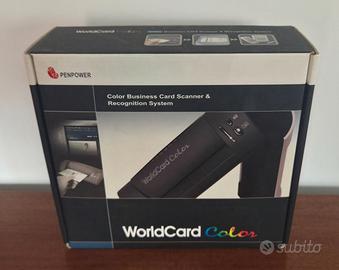 SCANNER BIGLIETTI DA VISITA PENPOWER. Modello WorldCard Color. Stampa a colori risoluzione 600 dpi, in formato A6, riconosce e conserva le immagini a colori dei biglietti da visita. Può essere utilizzato anche come un normale scanner a colori per scansionare foto a colori 4x6, figurine di baseball, figurine di giochi e altre figurine sportive. Dimensioni:LxAxP): lato cm 17,5 x altezza cm 4,5 x profondità cm 7,5, peso 216 g. Colore nero, nuovo nella scatola con libretto istruzioni e dvd installazione. Euro 179.