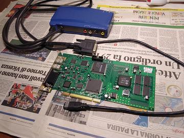 In ottimo stato e usata poco, provata e correttamente funzionante cedo una delle migliori schede PCI con modulo esterno per l'acquisizione audio video analogico e digitale, in circolazione nei primi anni 2000, Dazzle Fast DV Now AV. Dotata di ingressi e uscite RCA, SVideo, FireWire IEEE 1394 (segnale DV). Possibilità di acquisizione AV sia in PAL (720x576) o sistema Americano NTSC (720x480). Nel test eseguito, era montata su P4, 3GHz, su slot PCI. Funziona su Windows 98, ME, 2000, XP. Questo articolo è composto da due unità, quella interna montata su PCI e quella esterna per il collegamento delle periferiche. I video acquisiti, possono essere montati (ed eventualmente portati su DVD) con la vecchia versione di Adobe Premiere 6 o Ulead Media Studio Pro 6 e 6.5.
