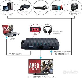 Vendo scheda acquisizione video HDMI, USB 3.0, capture card per PS4, PS3, Switch, Xbox, Treaslin HD 1080P, registratore di gioco per Mac, Windows, Linux OBS Xsplit. Usata solo 3 volte e in ottimo stato.