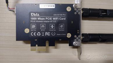 Vendo scheda di rete pcie Ubit AX-180 Pro. Supporta lo standard wifi6 e le bande a 2.4 e 5 GHz riuscendo a raggiungere i 1200 Mbps di velocità.