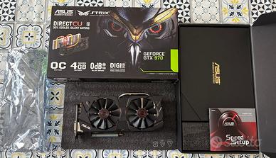 Vendo scheda grafica ASUS STRIX GTX 970 4GB OC, usata, perfettamente funzionante, e mai overclockata manualmente (è leggermente overclockata di fabbrica). Il pacco include la GPU, la scatola originale, completa di imbottimento interno e busta antistatica. E' incluso anche il manuale originale come da foto.