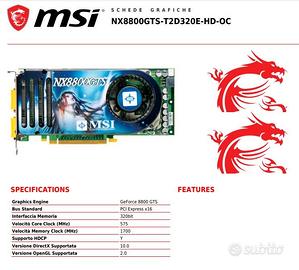 SCHEDA GRAFICA MSI GeForce 8800 GTS 320 MB GDDR3 PCI-e 2xDVI-I S-VIDEO NX8800GTS-T2D320E-HD-OC Consegna anche a mano in zona.