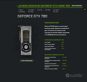 La NVIDIA GeForce GTX 780, con i suoi 2304 CUDA cores e 3 GB di memoria GDDR5 su interfaccia a 384-bit, questa scheda grafica offre prestazioni elevate per gaming e creazione di contenuti. Supporta le più avanzate tecnologie NVIDIA, tra cui GPU Boost 2.0, Adaptive V-Sync, PhysX e SLI, garantendo un'esperienza visiva senza paragoni. È inoltre dotata di un sistema di raffreddamento avanzato per prestazioni stabili anche sotto carico pesante.