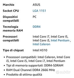 Vendo per passaggio a categoria superiore scheda madre marchio ASUS modello LHA 1151 + CPU processore INTEL CORE I-3 + kit memoria DDR 4 da 8GB + scheda video NVIDIA GeForce GTX 1050 come da foto allegate.
