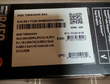 Vendo scheda madre marchiata MSI modello B450 Tomahawk Max La scheda si presenta in perfette condizioni ed è perfettamente funzionante Questa scheda MSI è in formato standard atx e presenta 4 slot per memoria ram e slot per disco NVME, è considerata una delle migliori schede per valori VRM e capacità di dissipazione, bios già aggiornato per ospitare le recenti cpu serie 5000 di Ryzen La scheda é venduta comprensiva di confezione originale, manualistica e tutti gli accessori come mascherina, vite per fissaggio disco NVME e cavi sata Per qualsiasi informazione non esitare a contattarmi, ritiro in zona Milano Sud altrimenti spedisco in tutta Italia