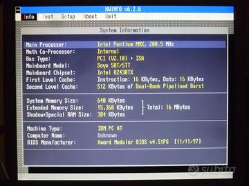 Vendo dalla mia collezione privata rara scheda madre SOYO SY-5BT Socket 7 funzionante con CPU Intel Pentium MMX 200MHz con dissipatore, 16MB RAM SIMM da 72 pin, scheda video S3 VIRGE/DX, scheda audio Sound Blaster CT4810 e scheda di rete ISA 16 bit. In ottime condizioni estetiche, condensatori integri. Bundle completo per assemblare un PC per retrogaming DOS/Windows 95. E' stata testata con un Hard Disk su Compact Flash usando un adattatore IDE-CF, funziona bene anche con dischi SSD sempre con adattatori IDE-Sata. Per foto aggiuntive o ulteriori test contattatemi. Fare offerte solo se interessati. Offerte insensate verranno rifiutate o lasciate scadere senza risposta. No affaristi o perditempo, chi è interessato è consapevole che è un oggetto del 1998 ben conservato. Per il corretto funzionamento sono richieste competenze specifiche e hardware datato. [EVV1F]