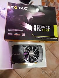Salve, Per cambio GPU vendo Zotac GTX 960 4GB tenuta maniacalmente, condizioni perfette sia hardware che estetiche, completa di scatola e manuali. Di seguito le principali specifiche: -Graphics Engine: NVIDIA GeForce GTX 960 -Bus Standard: PCI Express x16 3.0 -Interfaccia Memoria: 128 bits -Dimensione memoria (Mb): 4096 -Velocità Core Clock (MHz): 1241 MHz / 1178 MHz -Velocità Memory Clock (MHz): 7010 -Schermi massimi: 4 -Consumi Energetici (W): 120 -Supporto HDCP: Y -Display port: 3 (versione 1.2) Risoluzione Massima: 4096x2160 @60 Hz -HDMI: 1 (versione 1.4a/2.0)Risoluzione Massima: 4096x2160 @24 Hz (1.4a), 3840x2160 @60 Hz (2.0) -Alimentatore raccomandato (W): 400 -Connettori di alimentazione: 8-pin x 1 -Versione DirectX Supportata: 12 -Versione OpenGL Supportata: 4.4 -Dimensioni scheda (mm) 273 x 130 x 37 -Peso 593 gr Non spedisco, preferisco scambio a mano in zona.