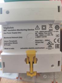Il dispositivo appartiene alla gamma Vigilohm, progettata per monitorare reti elettriche IT non collegate a terra, in conformità alle norme sull'installazione e sui prodotti. In conformità alle norme vigenti, si raccomanda di dotare i sistemi di dispositivi di monitoraggio dell'isolamento (IMD). Il dispositivo è dedicato al monitoraggio dei sistemi AC puri di piccole dimensioni con disturbi limitati. Misura la resistenza di isolamento del sistema iniettando una corrente DC tra la rete e la terra. La configurazione sarà eseguita a seconda dell'installazione. Le impostazioni possono essere eseguite nella parte anteriore del dispositivo. Possono essere impostate le soglie di allarme e di pre-allarme. Include una funzione di autodiagnostica manuale. Se la resistenza di isolamento del sistema scende al di sotto della soglia impostata significa che si è verificato un guasto di terra, e viene attivato un allarme attraverso il relè di uscita IMD. Se non viene rilevato nessun guasto, l'allarme viene azzerato e il relè di allarme torna alla normalità. Il prodotto puÒ essere installato su guida DIN.