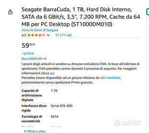 SEAGATE BARRACUDA 1 TB (1000GB) - Hard Disk Interno SATA. Condizioni assolutamente PERFETTE, prezzo di listino su Amazon: 60 euro (vedi foto), vendo a 20 euro. Disponibile per consegna a mano, o spedizione in tutta Italia.