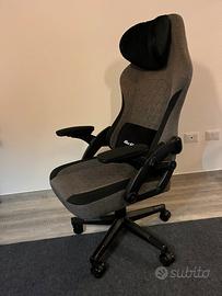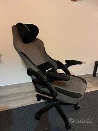 Sedia gaming Warblade in tessuto grigio/nero, ottime condizioni. Struttura ergonomica con schienale alto, cuscino lombare e poggiatesta imbottiti con logo Warblade, braccioli regolabili, base a 5 razze con ruote. Reclinabile, altezza regolabile con pistone a gas.