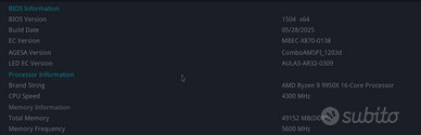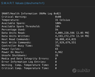 Vendo a malincuore fantastico server casalingo top di gamma. Il server e' stato assemblato a Giugno 2025. Le specifiche sono: - CPU : AMD Ryzen 9 9950x 16 Core. - RAM: 48x2GB DDR5 ECC UDIMM Unbuffered 5600Mhz modello KSM56E46BD8KM (nella foto e' montato solo 1 stick). - Scheda Madre: ASUS ProArt X870E-CREATOR WIFI (top gamma, supporta bifurcation senza problemi, ethernet 10GB) - Memorie: 2x Intel P5510 7.68TB U2 per un totale di 16TB, velocita' PCIe gen4. 2x Kingston KC3000 Nvme M2 2TB, velocita' PCIe gen4. - Alimentatore: LC-Power LC850P V3.0 80+ Platinum 850 Watt. - Schede extra: Scheda bifurcation da 2x U2 a pcie 16x. Permettono di usare le U2 in ZFS / mirror o altre configurazioni. - Ventole : 3x ARCTIC P8 Max, 2x ARCTIC P12 Max. - Dissipatore CPU: Thermalright Peerless Assassin 120 MINI. - Case: UNYKAch Rack 4U 19″ UK 4329 Tutta la configurazione e' stata pensata per essere sempre performante nel tempo. La scheda madre supporta ECC che sfrutta a pieno le ram, e bifurcation per le memorie U2. Le memorie u2 hanno 95% di vita rimanente (e sono il costo principale di questo sistema), mentre le nvme sono praticamente nuove. Il prezzo e' leggermente trattabile. Il sistema e' montato su un rack che comprende anche 3 mini pc beelink n100 16gb ram 512gb memoria (sostituita), una jetkvm con switch, un patch panel, switch 1gb, UPS per i mini pc e gli accessori. Posso vendere in blocco a 5000. Posso fornire informazioni se interessati. Per motivi di peso e delicatezza non spedisco, si puo' ovviamente visionare e controllare di persona.