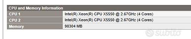ProLiant BL460c G6 CPU 1 Intel(R) Xeon(R) CPU X5550 @ 2.67GHz (4 Cores) CPU 2 Intel(R) Xeon(R) CPU X5550 @ 2.67GHz (4 Cores) Memory 98304 MB In omaggio 2HD SAS 36GB 10k