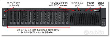 Lenovo ThinkSystem SR550 — Server Rack 2U Processori 2x Intel Xeon Silver 4116 (12 core / 24 thread, 2.1GHz, fino a 3.0GHz Turbo, 85W TDP) Memoria 32 GB DDR4 Storage 3x HDD SAS 600 GB 10K rpm 2.5" hot-swap Controller RAID Lenovo ThinkSystem RAID Rete 2x 1GbE onboard (LOM) Management Lenovo XClarity Controller (iLO equivalent) Alimentazione 2x 750W Ridondante hot-swap 80 PLUS Form factor 2U Rack
