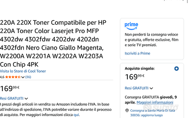 Ottimizza i costi di stampa senza rinunciare alla qualità professionale con il set completo di cartucce Cool Toner, specificamente progettato per le stampanti HP Color LaserJet Pro serie 4000. Caratteristiche Principali: Chip Integrato "Plug & Play": A differenza di altre versioni economiche, queste cartucce sono già dotate di chip. Non dovrai rimuovere o installare manualmente il chip originale; basta inserire la cartuccia e iniziare a stampare immediatamente. Contenuto del Pacchetto: Il set include 4 cartucce (1x Nero, 1x Ciano, 1x Magenta, 1x Giallo) per una sostituzione completa del kit colore. Resa Elevata e Costante: Progettate per garantire una copertura del 5% su fogli A4, con una resa di: 2.000 pagine per il toner Nero (W2200A). 1.800 pagine per ciascun colore (W2201A, W2202A, W2203A). Compatibilità Garantita: Questo kit è pienamente compatibile con i seguenti modelli di stampante: HP Color LaserJet Pro MFP: 4302dw, 4302fdw, 4302fdn. HP Color LaserJet Pro: 4202dw, 4202dn. Perché Scegliere Cool Toner: Qualità di Stampa: Polvere di toner di alta qualità per testi nitidi e colori vivaci, ideali per documenti aziendali e presentazioni. Risparmio Intelligente: Ottieni le stesse prestazioni delle cartucce originali (OEM) a una frazione del costo. Affidabilità: Progettate per prevenire perdite o danni alla testina di stampa, garantendo un flusso di lavoro senza interruzioni. Nota Tecnica: All'installazione, la stampante potrebbe segnalare l'uso di una cartuccia non originale. È sufficiente confermare e cliccare su "OK" per proseguire con l'utilizzo standard.