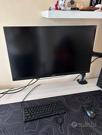 Vendo per inutilizzo set-up completo a doppio monitor, perfetto per gaming, smart working o streaming. I monitor sono montati su un robusto braccio meccanico regolabile che libera spazio sulla scrivania. 1. Monitor Principale: Acer EG270 (27 pollici) • Risoluzione: Full HD (1920x1080) • Frequenza: 144Hz (ideale per gaming fluido) • Pannello: LED IPS (ottimi colori e angoli di visione) • Condizioni: Perfettamente funzionante. Segnalo un leggero residuo di nastro adesivo sul retro (come da foto) che non influisce minimamente sulle prestazioni. 2. Monitor Secondario: ASUS VA24EHE (23.8 pollici) • Risoluzione: Full HD • Caratteristiche: Tecnologia Eye Care per non affaticare la vista. • Orientamento: Attualmente montato in verticale (perfetto per chat, codici o lettura), ma posizionabile anche in orizzontale. • Condizioni: Ottime, anch'esso con piccoli segni di nastro sul retro. 3. Supporto: Braccio Doppio da Scrivania • Struttura in acciaio nero ultra resistente. • Completamente regolabile (altezza, inclinazione e rotazione 360°). • Aggancio a morsetto (non serve forare il tavolo). • Include alloggiamento per le chiavi a brugola (visibili in foto) per regolazioni rapide. Note: • Cavi di alimentazione inclusi. • È possibile acquistare pezzi singolarmente, prezzo leggermente trattabile se acquistato in blocco.