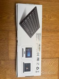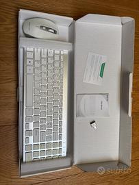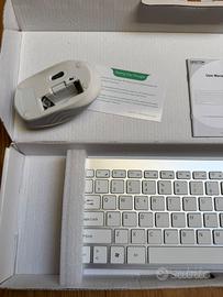 Vendo set completo wireless (tastiera + mouse) della OMOTON, colore argento con tasti bianchi. Design ultrasottile, perfetto per chi cerca un'estetica pulita in stile "Apple" ma per ambiente Windows. Caratteristiche principali: Connessione: Wireless 2.4GHz tramite un unico ricevitore USB (incluso) che controlla sia tastiera che mouse. Layout: Italiano (QWERTY) con tasti multimediali. Design: Tastiera slim a basso profilo, molto silenziosa e leggera. Compatibilità: Windows 7/8/10/Vista e Laptop. Condizioni: Pari al nuovo, testato e perfettamente funzionante. Contenuto della confezione: Tastiera Wireless Argento/Bianca. Mouse Wireless coordinato. Ricevitore USB (riposto nel vano batterie del mouse o della tastiera). Manuale d'uso originale. Scatola originale. Nota: La scatola esterna mostra il modello di colore nero, ma il prodotto all'interno è la versione Bianco/Argento come visibile in foto.