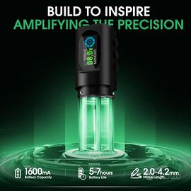 Nuovo Nuovo con valigetta in similpelle. Kit Tatuaggi Professionale, Macchinetta Tatuaggi Senza Fili con Corsa Regolabile 2.0-4.2mm e 1600mAh Batteria, Macchina Tatuaggi Kit Completo con Stampante Stencil Tattoo e Revo Cartucce Tattoo La macchinetta per tatuaggi wireless InkFlexo è realizzata in alluminio aeronautico di alta qualità, garantendo sia durata che leggerezza. Misura 137 mm in lunghezza e 32 mm in diametro e pesa solo 205 g (7,2 once), offrendo una presa comoda per lunghe sessioni di tatuaggio. Il design staccabile facilita smontaggio, manutenzione e sostituzione delle parti, rendendola ideale per professionisti e principianti. 【Gamma di corsa regolabile】 La pistola per tatuaggi InkFlexo offre un'ampia gamma di lunghezze di corsa da 2,0 mm a 4,2 mm, consentendo agli artisti di passare senza problemi tra le diverse tecniche di tatuaggio. Che tu stia lavorando su sfumature morbide di nero e grigio, riempimento di colori, sfumature o linee precise, la manopola di regolazione facile da girare consente una rapida personalizzazione della lunghezza della corsa per soddisfare le diverse esigenze dei tuoi progetti artistici. 【Motore senza nucleo ad alta potenza】 La penna della macchinetta per tatuaggi wireless è dotata di un robusto motore senza nucleo che funziona a 12.000 giri al minuto, offrendo potenza per una deposizione rapida dell'inchiostro con un trauma cutaneo minimo. Il funzionamento a basse vibrazioni e silenzioso garantisce un'esperienza confortevole per tatuatore e cliente, mentre il sistema avanzato di ruote eccentriche migliora la capacità di rivestimento e ombreggiatura. 【Batteria a Lunga Durata】Dotato di una batteria ad alta capacità da 1600 mAh, InkFlexo offre fino a 5-7 ore di tatuaggio continuo con una singola carica, a seconda della tensione di uscita. L'intervallo di tensione operativa di 4-12 V (equivalente a 45-170 Hertz) garantisce la flessibilità di regolare i livelli di potenza per soddisfare le varie esigenze del tatuaggio.
