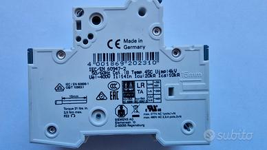 Interruttore modulare Siemens, conforme alle norme IEC/EN 60898-1 e 60947-2. Offre una corrente nominale di 14 A, tensione fino a 400 V~ e un’elevata capacità di interruzione di 20 kA con Ics 10 kA,