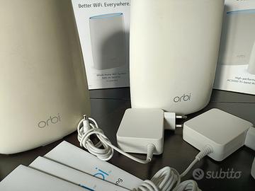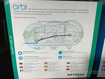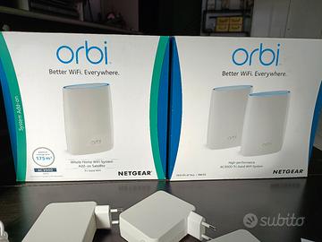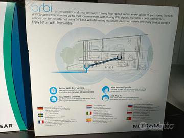 Sistema Netgear Orbi composto da Router e 2 satelliti, che copre circa 350mq+175mq. Perfetto completo di scatola, Cd di installazione ed istruzioni. Perfettamente funzionante.