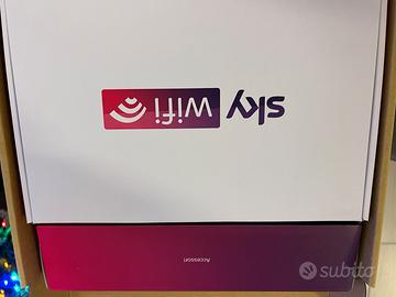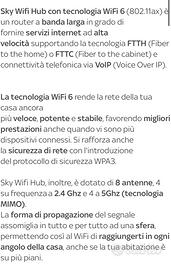Sky Wifi Hub con tecnologia WiFi 6 (802.11ax) è un router a banda larga in grado di fornire servizi internet ad alta velocità supportando la tecnologia FTTH (Fiber to the home) o FTTC (Fiber to the cabinet) e connettività telefonica via VoIP (Voice Over IP)