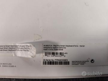 Vendo Smart Keyboard Folio originale Apple per iPad Pro 11", layout italiano, modello MU8G2T/A. Il codice MU8G2T/A è la versione italiana per iPad Pro 11", con tastiera QWERTY ITA nera. La tastiera è usata ma ancora perfetta, completamente funzionante e pronta all’uso. La Smart Keyboard Folio si collega magneticamente all’iPad e non richiede ricarica né abbinamento. Condizioni estetiche ottime / molto buone, da usare subito. “piccoli segni dovuti al normale utilizzo”.