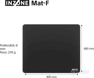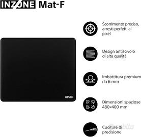 marca sony, modello inzone mat f, codice mpdf900b.ww, colore nero, uso consigliato gaming, materiale tessuto poliestere con rivestimento idrorepellente, base antiscivolo slimflex, paese di origine taiwan.