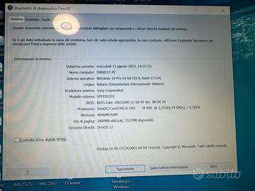 PC Sony Vaio funzionante con schermo da 18,4". Specifiche tecniche visibili nelle foto, sistema Operativo Windows 10 pro.