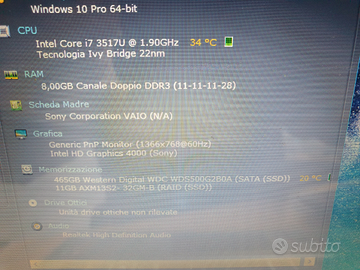 Vendo portatile Sony Vaio svt1312x1es in buone condizioni estetiche, processore intel i7 di 3 generazione, 8 gb di ram, 2 ssd uno da 32gb e uno da 500gb, come da foto allegate.