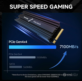 Prestazioni Eccezionali: Il SSD fanxiang S880E da 1TB è progettato per giochi e lavoro, offrendo velocità di lettura fino a 7100 MB/s e velocità di scrittura fino a 6100 MB/s. Grazie all'interfaccia PCIe 4.0 Gen4x4 e al protocollo NVMe, garantisce prestazioni rapide e senza interruzioni per avviare applicazioni, trasferire file di grandi dimensioni o giocare Design Avanzato Per la Dissipazione Del Calore: Il fanxiang S880E da 1TB utilizza un design con pad di raffreddamento in grafite, mantenendo una temperatura stabile anche sotto carichi elevati. Questa soluzione migliora le prestazioni durature del dispositivo, ideale per appassionati di tecnologia, gamer e professionisti, assicurando una gestione termica efficiente Ampia Compatibilità: Il fanxiang S880E da 1TB è altamente compatibile con vari dispositivi, tra cui desktop, laptop e console di gioco PS5. Questo SSD interno offre una soluzione versatile per migliorare lo storage e le prestazioni, adattandosi a molteplici esigenze degli utenti Garanzia di 5 anni: Il SSD M.2 fanxiang da 1 TB è coperto da una garanzia di qualità di 5 anni. Durante questo periodo, forniamo un supporto post-vendita completo per garantire la protezione dei vostri diritti. Siamo impegnati a fornire assistenza affidabile per una tranquillità duratura Garanzia di qualità: Come produttore con la propria fabbrica, controlliamo rigorosamente ogni fase del processo produttivo, garantendo l'alta qualità di ogni prodotto fanxiang. Ogni disco è sottoposto a rigorosi test di qualità per offrire un'esperienza di acquisto affidabile e sicura ai nostri clienti