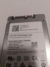 SSD da 256 GB LITE-ON model CV3-CE256, SATA III (6 Gb/s), velocità tipica di lettura fino a 490 MB/s, velocità tipica di scrittura fino a 380 MB/s. Pari al nuovo controllato con Cristal Disk Info con esito Buono al 100%, 375 accensioni, 975 ore di accensione.