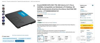 Vendo SSD interno Crucial BX500 da 1TB (modello CT1000BX500SSD101) in formato 2,5”, ideale per dare nuova vita a PC e notebook. Perfetto per: •velocizzare computer lenti •sostituire vecchi hard disk meccanici •uso quotidiano, lavoro e multimedia Caratteristiche principali: •Capacità: 1TB •Interfaccia: SATA 6Gb/s •Velocità fino a 540 MB/s •Tecnologia 3D NAND •Silenzioso, affidabile e a basso consumo Attualmente su Amazon costa 164.99 Euro