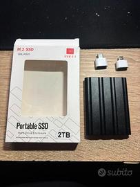 Unità di memoria SSD esterna da 2TB (Terabyte), NUOVA e mai utilizzata. Dispositivo ultra-compatto con scocca in metallo dissipante, ideale per il backup di grandi quantita di dati, archiviazione foto/video e trasferimento file ad alta velocità grazie all'interfaccia USB 3.1. Specifiche Tecniche: • Capacità: 2TB. • Interfaccia: USB 3.1 Type-C (compatibile con Thunderbolt 3/4). • Materiale: Case in alluminio satinato nero per una migliore gestione del calore e resistenza agli urti. • Compatibilità: Plug & Play su Windows, macOS, Android e Console (PS5/Xbox). • Accessori inclusi: Due adattatori (USB-C e Micro-USB) per il collegamento diretto a smartphone e tablet. • Dimensioni: Ultra slim e tascabile.