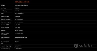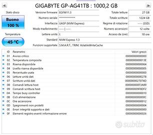 SSD NVMe GIGABYTE AORUS GP-AG41TB 1TB Gen4 - linea PREMIUM GIGABYTE 🔥 SPECIFICHE PREMIUM: PCIe Gen4 x4 - velocità fino a 5000 MB/s lettura / 4400 MB/s scrittura Capacità totale: 1TB (1000GB) Memoria 3D TLC NAND - affidabilità Enterprise MTBF 1.770.000 ore - resistenza estrema (850 TBW) ✅ CONDIZIONI ECCELLENTI: Solo 18 ore totali funzionamento (12 accensioni) - vedi screenshot SMART Health 100% - screenshot COMPLETO in inserzione Utilizzo reale effettuato: 27GB letture / 1224GB scritture Temperatura operativa: 45°C (perfetta) Zero errori, zero settori danneggiati 🎯 GARANZIA + VALORE: Garanzia GIGABYTE 5 anni - da attivare (trasferibile) AORUS = Top-Tier GIGABYTE (componenti superiori, qualità massima) Ideale gaming 4K, rendering, editing video, workstation intensive 📦 MODALITÀ VENDITA: SOLO SPEDIZIONE con tracciamento completo. Pagamento tramite TuttoSubito (protezione acquirente/venditore) Imballo antistatico professionale + scatola rinforzata Spedizione entro 24h da conferma pagamento Numero tracking fornito immediatamente No ritiri di persona. Transazione 100% sicura e documentata.