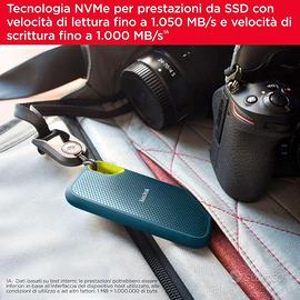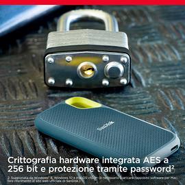 SanDisk 1TB Extreme SSD portatile, USB-C, Unità a stato solido NVMe esterna, fino a 1050 MB/s, Indice di protezione IP65 per la resistenza ad acqua e polvere - Monterey Tecnologia NVMe per prestazioni da SSD con velocità di lettura fino a 1.050 MB/s e velocità di scrittura fino a 1.000 MB/s in un'unità di storage portatile ad alta capacità, perfetta per creare contenuti innovativi o girare riprese fantastiche Con una resistenza alle cadute da massimo tre metri e un indice di protezione IP65 contro acqua e polvere, questa unità di storage è pronta per essere messa alla prova Viaggia senza problemi grazie alla garanzia limitata di 5 anni (vedi sito web ufficiale di SanDisk) e al resistente rivestimento in silicone che dona alla parte esterna dell'unità una piacevole sensazione tattile e un ulteriore livello di protezione Usa il pratico moschettone per agganciarla saldamente al passante o allo zaino per maggiore sicurezza Consente di mantenere riservati i contenuti privati con la crittografia hardware integrata AES a 256 bit e protezione tramite password