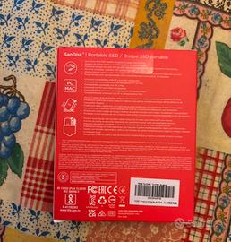 SSD esterno SanDisk da 1 TB, formato compatto e tascabile. Scocca nera con finitura gommata e piccolo occhiello verde per agganciarlo o tenerlo al laccio. Velocità di lettura dichiarata fino a 800 MB/s, pensato per trasferimenti rapidi di file, backup e uso in mobilità. Collegamento USB-C, compatibile con PC, Mac e dispositivi recenti. Confezione retail rossa classica SanDisk