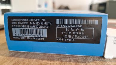 Vendo SSD esterno portatile Samsung T5 EVO da 2TB (2000 GB). Il prodotto è NUOVO, completo di scatola originale [aggiungi: ancora sigillata / aperta solo per controllo]. Si tratta del modello recente di Samsung (T5 EVO), progettato per essere estremamente resistente agli urti (fino a 2 metri di caduta) e comodo da trasportare grazie al design con anello integrato. Caratteristiche: Modello: T5 EVO (USB 3.2 Gen 1). Capacità: 2TB (Spazio enorme per foto, video, backup). Velocità: Trasferimento fino a 460 MB/s. Resistenza: Design gommato anti-urto e protezione dalle cadute. Compatibilità: Universale (Windows, Mac, Android, Console, Tablet).