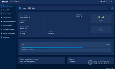 Disco in Buone condizioni Produttore : Lexar Modello : MS100 Capacità SSD : 256 GB Fattore di forma : 2,5" Interfaccia : SATA 6 Gbit/s Tecnologia NAND : 3D TLC NAND Velocità di lettura sequenziale: Fino a 550 MB/s Velocità di scrittura sequenziale : Fino a 520 MB/s Resistenza (TBW) : 140 TB Spedizione Veloce