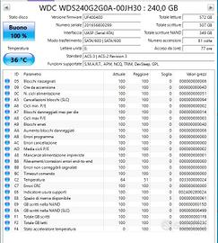 Vendo SSD Western Digital Green da 240GB (modello WDS240G2G0A). Il disco è stato utilizzato pochissimo ed è in condizioni eccellenti, come dimostrato dallo screenshot dello stato SMART (disponibile tra le foto): Stato di salute: 100% Ore di attività: Solo 77 ore (praticamente nuovo) Accensioni: Solo 81 volte Dati scritti totali: Circa 500 GB (una frazione minima della sua vita utile) Temperatura di esercizio: Ottimale (36°C) Capacità: 240 GB Formato: 2.5 pollici / 7mm Interfaccia: SATA III 6 Gb/s Velocità: Fino a 545MB/s in lettura Esteticamente perfetto condizioni pari al nuovo. Si vende come usato.