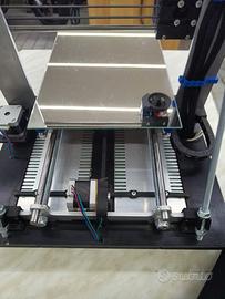 Tecnologia FDM (Fused Deposition Material)– Telaio in Alluminio– Kit Barre Trapezie incluso– Area di stampa singolo estrusore 310x230x270 (LxPxH in mm)– Temperatura di stampa: max 260°C– Risoluzione posizionamento X/Y: 0,006mm– Risoluzione posizionamento Z: 0,00015mm– Risoluzione di stampa da 0,05 mm ( con ugello 0,25 – 0,1mm con ugello 0,4)– Diametro ugello 0,4mm standard (disponibili da 0,25mm a 0,8mm)– Diametro filamento 1,75mm– Velocità di stampa fino a 100mm/s (reali)– Piano di stampa non riscaldato– Sensore fine-filo (mette in pausa la stampa e consente il cambio del filamento)– Dimensioni esterne: 450x520x530 (LxPxH in mm)– Peso: 14,4 Kg– Elettronica compatibile Arduino Mega 2560 con Firmware Open Source MarlinKimbra– Schermo LCD FullGraphic (128×64)– Lettore SD card– Possibilità di doppio estrusore per 2 materiali/colori con singolo HotEnd– Consumo: 120W Max