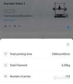 Vendo stampante 3D Anycubic Kobra 3 perfettamente funzionante, usata con cura. Insieme alla stampante è incluso ACE Pro, un piatto cold e la fotocamera per monitorare le stampe. La stampante ha lavorato per 240 ore e 45 minuti, con un totale di 133 stampe. Tutto è in ottime condizioni e pronto all’uso