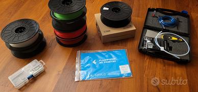 Inclusi tutti gli accessori e ricambi di serie (viti, tappetino per piatto riscaldante, attrezzi) + tutte le bobine di filamento PLA acquistate nel tempo.