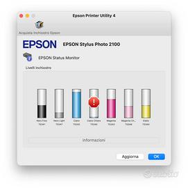 Vendo stampante A3+ Epson Stylus Photo 2100, perfettamente funzionante ma con cartucce di magenta e giallo che non stampano, necessitano cicli di pulizia, come si vede dalla prova di stampa effettuata in data 4 marzo 2026.