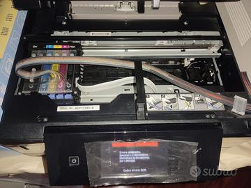 La stampante si accende ma da questo errore (0X9A) in seguito alla pulizia manuale della testina di stampa. E' installato un firmware che elimina il chip delle cartuccie e quindi le vede sempre piene e associato ad un kit di stampa continua. La vendo come non funzionante o parti di ricambio. Spedizione a carico dell'acquirente.
