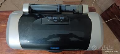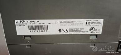 Stampante Epson C66 senza cavi di collegamento e con difetto alla porta frontale come da foto numero 4 (in pratica lo sportellino anteriore non si regge più su un lato). La stampante si accende e, prima di essere riposta a deposito, era funzionante, nel senso che stampava. Ottima per pezzi di ricambio o per chi sia capace a sistemarla