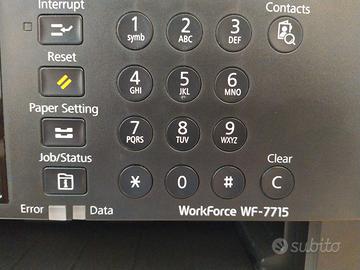 Stampante multifunzione Epson Work force WF-7715 praticamente nuova perché usta poco. Funzione come stampante bianco-nero e colori, scanner, fax. Lavora in wi-fi. Formato A4 e A3. Sprovvista di scatola ma completa di istruzioni.