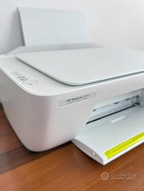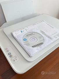 Stampante multifunzione con scanner HP modello Deskjet 2130, completa di cavi e istruzioni.